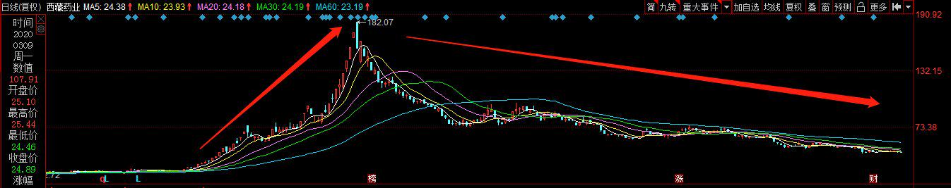 多个热点刺激下,西藏药业在3个月时间里,股价暴涨超过3倍。现在来看,西藏药业股价不到46元,相距高点跌幅超70%。