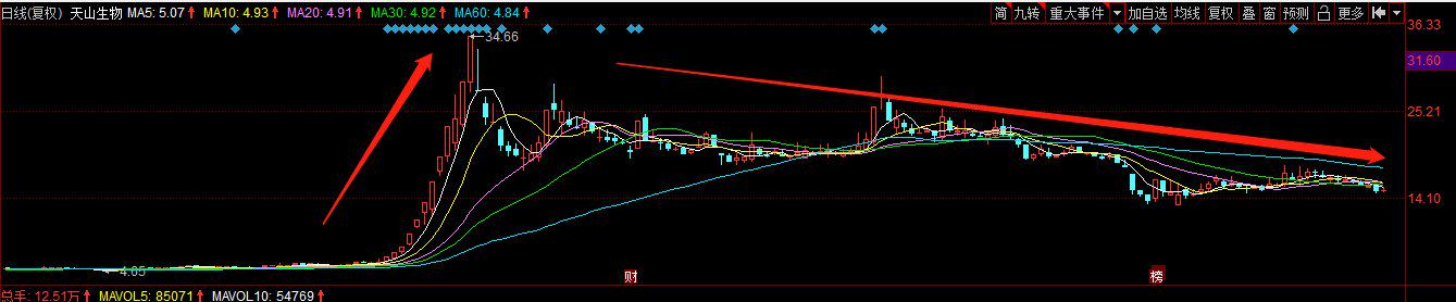 随着天山生物遭到监管,股价开始走下坡路。现在来看,天山生物股价不到15元,相距高点跌幅超50%。
