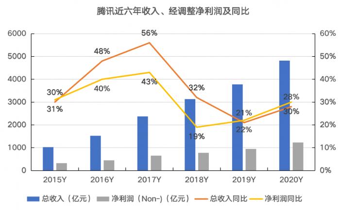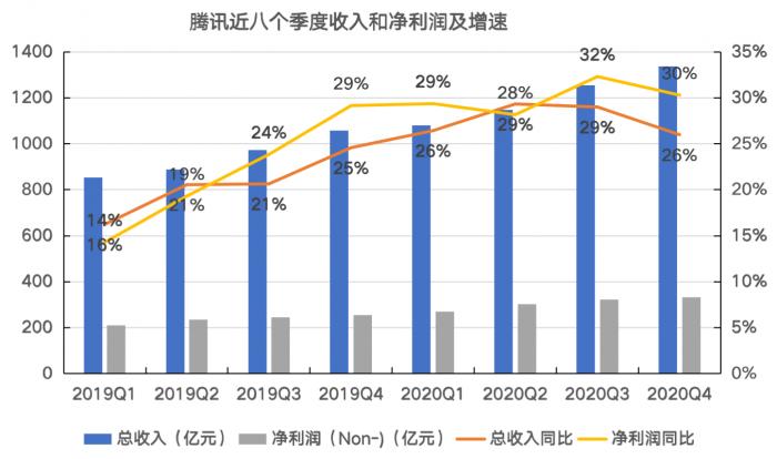 上图是腾讯2019年以来的分季度收入和经调整净利润增速,从上图可以看到,2020年三季度之前,公司的收入和经调整净利润都在稳步恢复,但是到了四季度突然拐头,收入增速从2020年三季度的29%回落到26%,经调整净利润增速从三季度的32%回落到30%。