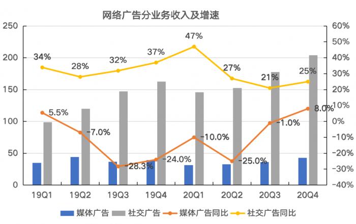 2019年,公司的网络游戏业务还没有太大起色,受宏观经济因素影响,公司另一项核心业务也“沦陷”,当年网络广告业务增速也从2018年的44%回落到2019年只有18%。网络广告业务约占公司总收入的18%。