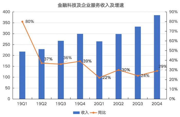 再看金融科技及企业服务业务,这部分业务除了金融科技业务外,还包括云服务业务,从上图可以看到,这部分业务2020年四个季度和2019年的四个季度相比,明显下了一个台阶,但是如果只看最近四个季度,则增速变化不大。也并非去年四季度业绩放缓的主因。