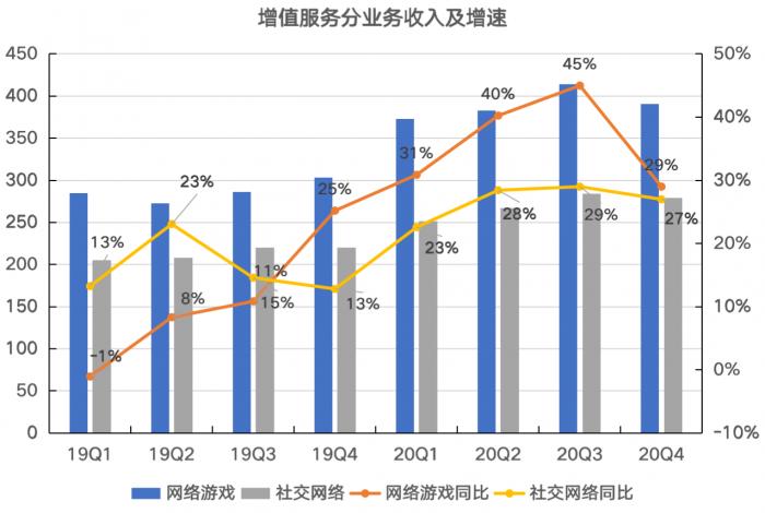上图是腾讯的网络广告业务,从图中可以看到,公司的媒体广告在连续6个季度负增长之后,终于转正。但是因为这部分业务一个季度只有几十亿的体量,占比非常小,可以忽略不计。公司的社交广告业务2020年四季度增速恢复到了25%。从增速看,表现比三季度好。总体来看,网络广告业务在四季度的表现要好于三季度,不是腾讯四季度业绩放缓的主要原因。