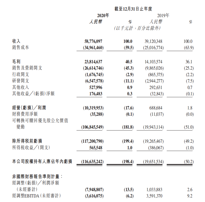 实际上,快手2020年录得经营亏损人民103亿元,经营利润率为-17.6%,2019年则录得经营利润人民币688.7百万元,经营利润率为1.8%。按照非国际财务报告准则计量,快手2020年全年经调整后的净利润亏损79.48亿元。