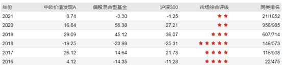 分年份来看,曹名长在2019年之前业绩都还是拔尖的。2016年和2018年的大跌中他把基金回撤控制得很好,2016年偏股混合型基金平均下跌14.35%的情况下,他管理的中欧价值发现还微涨了4.12%;而在2018年的大跌之年,中欧价值发现跌幅19.25%,作为一只偏股型基金,也已经是相当可以了。