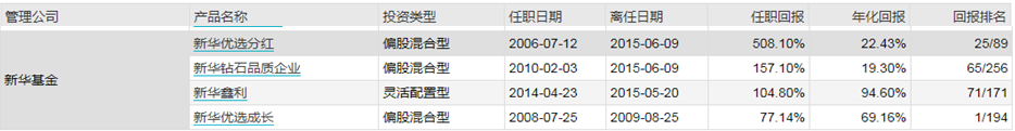 在新华基金期间,曹名长就已经声名鹊起,他的代表产品新华优选分红混合,2006 ~ 2015年长达8年的管理时间中,任职回报高达501.94%。观察其在新华的其它几只产品,收益也非常可观。