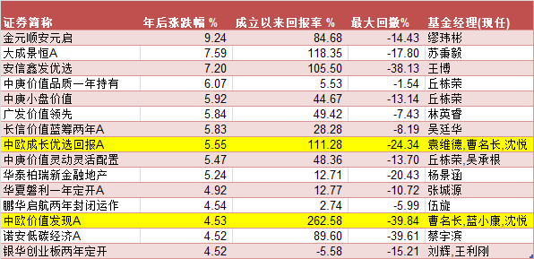 苏秉毅、邱栋荣、林英睿、曹名长等过去两年与市场风格格格不入的深度价值派的产品业绩开始领跑,在牛年这波下跌中,这几位大佬的产品则系数录得上涨。