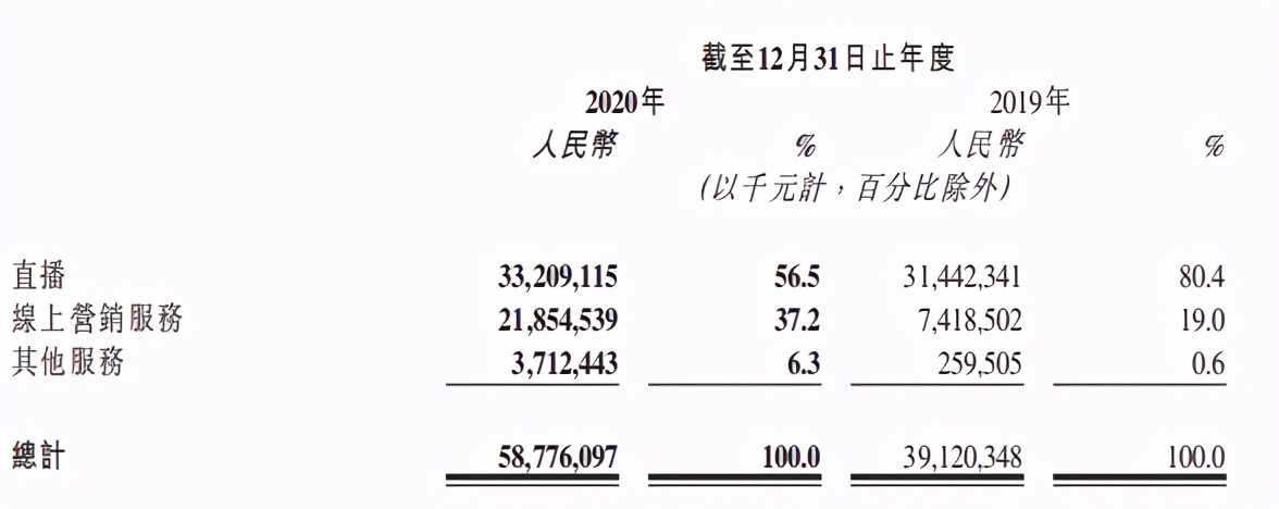 在商业化层面,2020年,快手收入主要来自直播、线上营销服务(广告等)以及来自电商的其他服务。