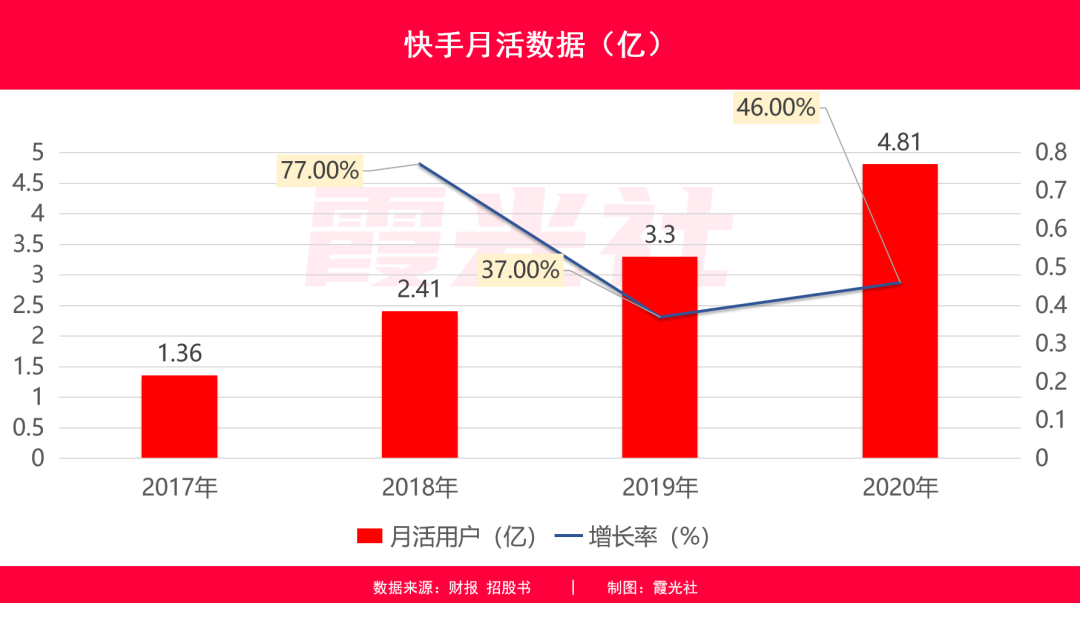 乍一看,这是一个相当不错的用户数据。甚至如果把时间线再放长一些,过去四年来,快手的用户月活基本保持着高速增长态势,一路从2017年的1.36亿增长至2020年的4.8亿,特别是去年的增长十分可观。