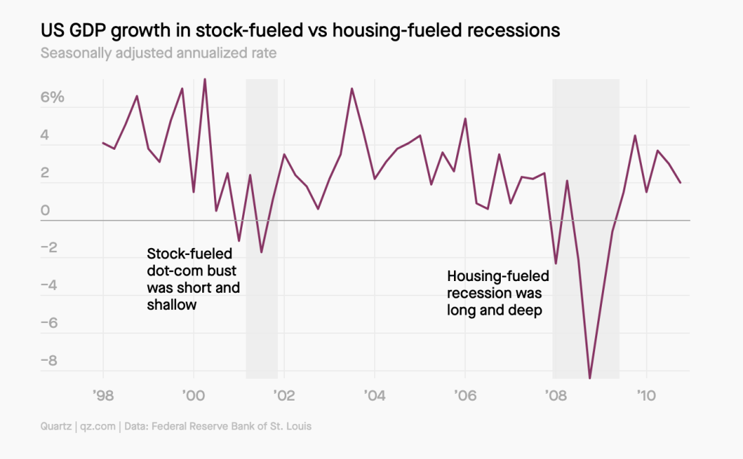 泡沫被戳破后的余波也并非全都难以承受。乔治梅森大学的经济学家Beckworth指出,相比于住房危机,90年代的科技繁荣泡沫波及的范围更小。因为科技繁荣泡沫是由股权融资的,它所打击的基本上是科技公司及其投资者,而住房危机则是破坏了整个经济。科技繁荣泡沫破裂产生的经济衰退持续较短、影响较浅,这场持续危机仅持续八个月,对经济发展和社会就业的影响微乎其微。