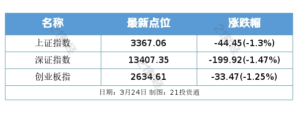 3月24日,A股三大指数集体跌幅逾1%,上证指数跌1.3%,报3367.06点;深证成指跌1.47%,报13407.35点;创业板指跌1.25%,报2634.61点。