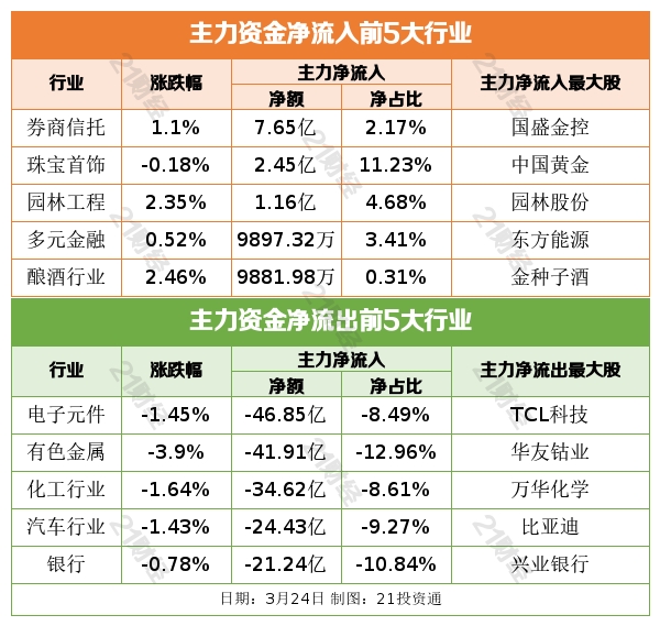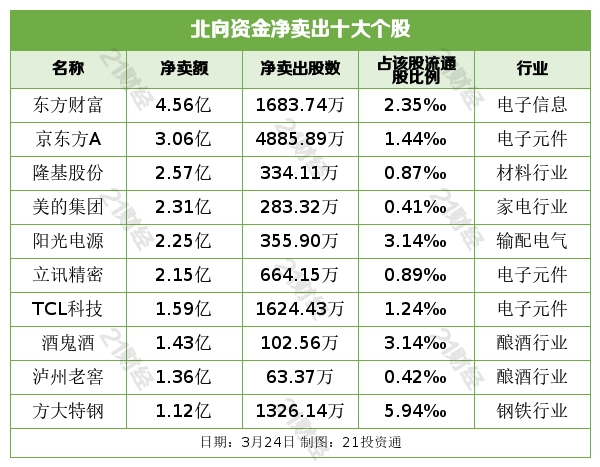 北向资金减持了21个行业,其中电子元件最多,净卖出金额达4.85亿元,其次是电子信息行业,净卖出4.16亿元。