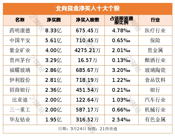 个股方面,北向资金净买入药明康德(603259.SH)、中国平安(601318.SH)、紫金矿业(601899.SH)、贵州茅台(600519.SH)、福耀玻璃(600660.SH)居前。