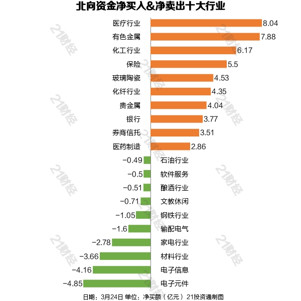 从净买入金额来看,北向资金增持了39个行业,其中医疗行业居首,净买入金额达8.04亿元,其次是有色金属行业,净买入7.88亿元。