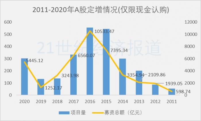 2020年2月14日,再融资新规落地,持续了3年严冬的定增市场迎来了生机。2020年,全市场定增项目募资总额为5445亿,是2019年的4倍。