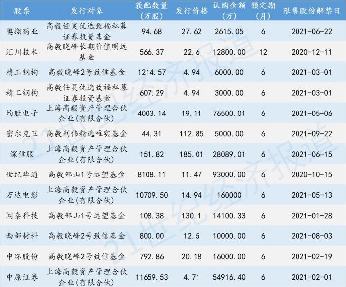 据21世纪经济报道记者统计,2020年,高毅资产共参与了A股11家上市公司项目的定增,2021年初新增1家密尔克卫的项目。这家千亿规模私募在上述项目投资的总金额近50亿,让多数私募机构们对其刮目。因为对于市场上绝大多数私募来说,规模上百亿足以令人称道,而高毅的定增金额就已经接近50亿。