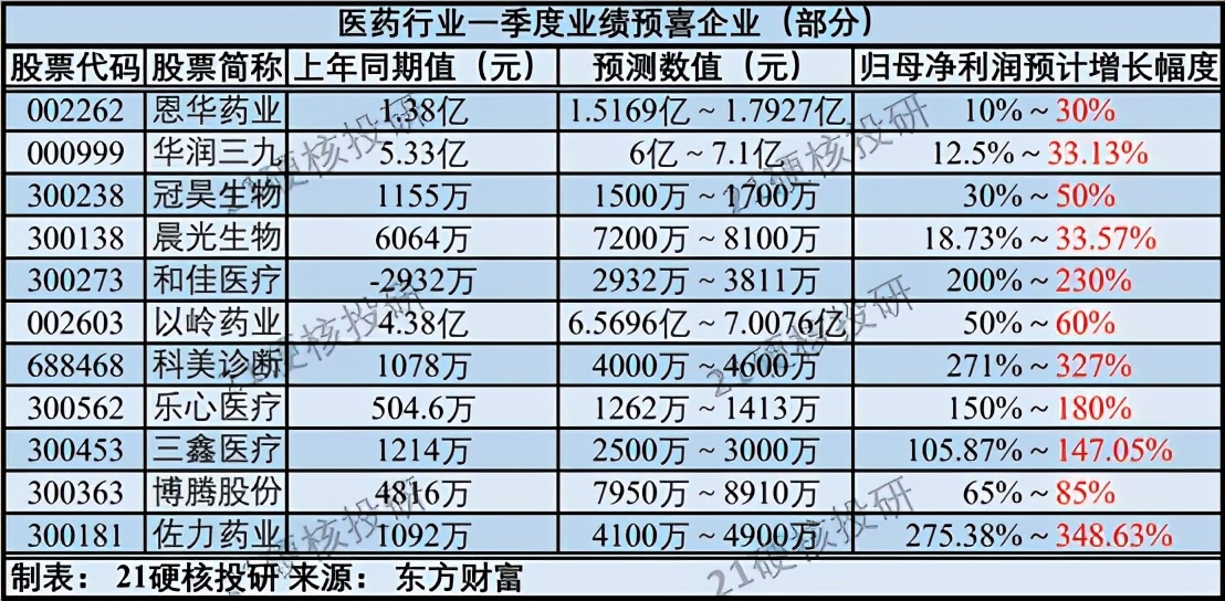 有机构对64家医药上市公司2021年一季报业绩进行了预测,预计: