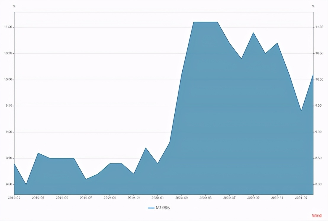 去年疫情期间,国内经济几近停摆,2020年3月当局大幅增加了货币投放,从2月份的8.8%一下增加到3月份的10.10%,随后的4、5、6月M2增速更是高达11.1%。但随着疫情逐渐控制,政府开始有意控制货币投放量,M2增速回落。