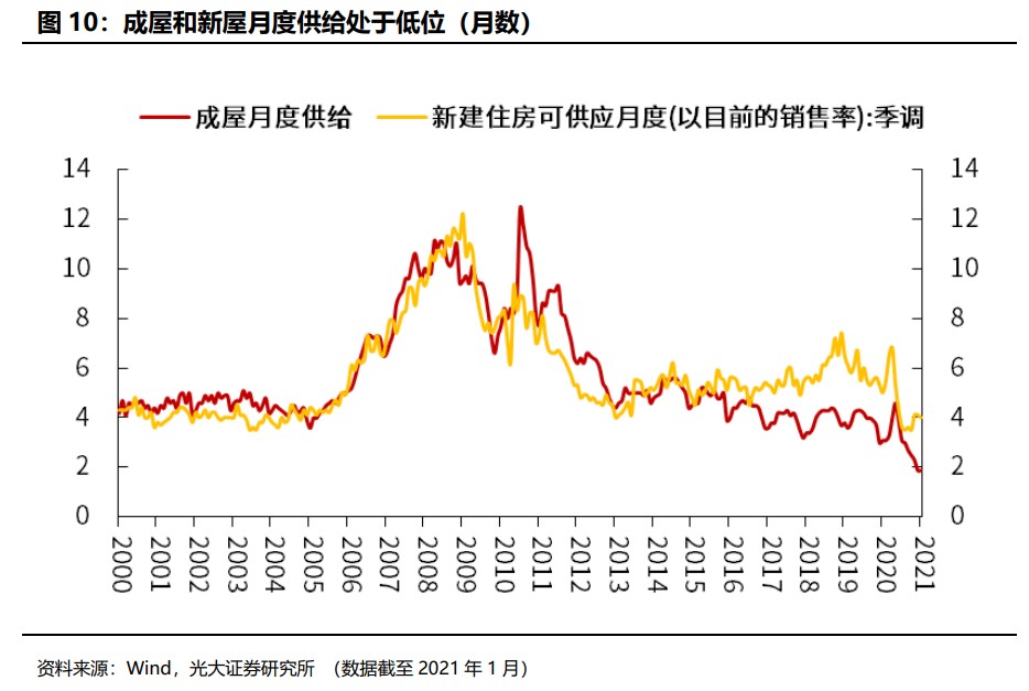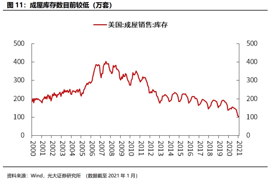 供给端,库存位于2000年来低位,地产投资补库存或已开启。一方面,目前美国成屋和新屋库存均处低位。2021年1月,新屋可供月度供给为4个月,即按目前销售速度,当前库存仅可覆盖销售4个月。同时,2021年1月,美国成屋月度库存仅为1.9个月,目前为104万套,处于2000年来低位。美国房地产市场存在一定供不应求态势,一定程度上推高房价。