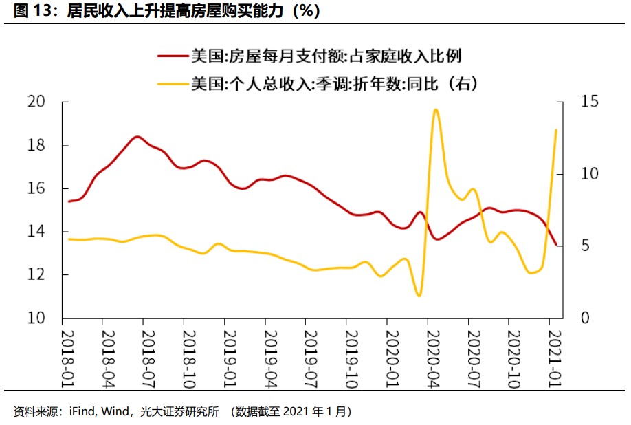 居民收入端,财政刺激下居民收入未明显受损,房屋购买力仍强。房价收入比为房屋每月支付额占家庭收入比重,反映居民对于住房的支付能力。由于美国政府开展多轮财政刺激,多次为居民派发现金,居民总收入大增,叠加低贷款利率,房价收入比上升,居民房屋购买能力提高,一定程度上促进地产热。