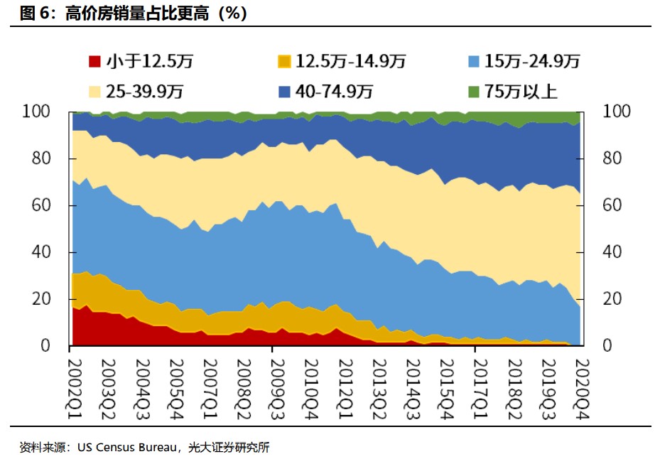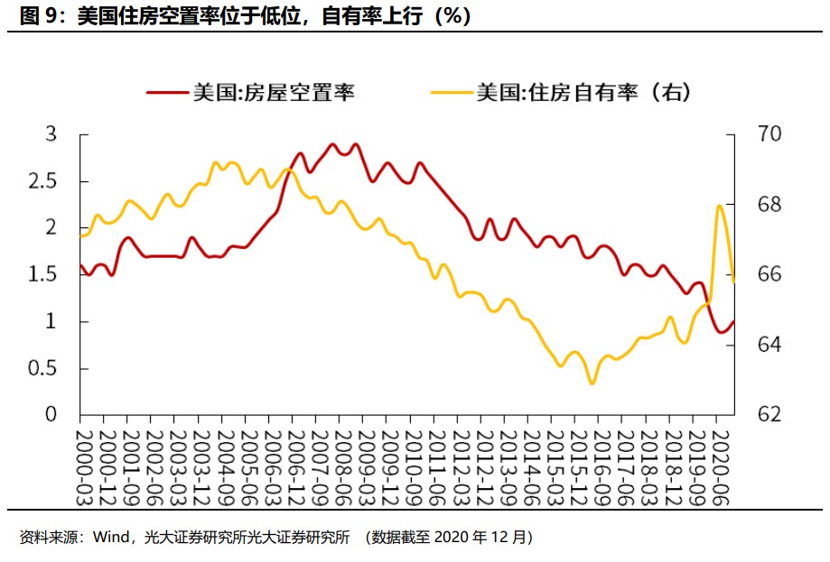 需求旺盛,房屋空置率持续下降。美国房屋空置率(定义为待出售空置房屋数/居民居住房屋数及总空置房屋数的和)目前已降至2000年来低点,2020年12月仅为1%,显示市场上待出售空置房屋数已较低。同时,居民住房自有率持续上升,显示真实居住需求较高。
