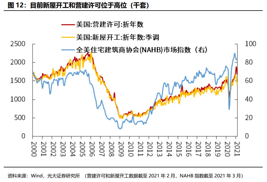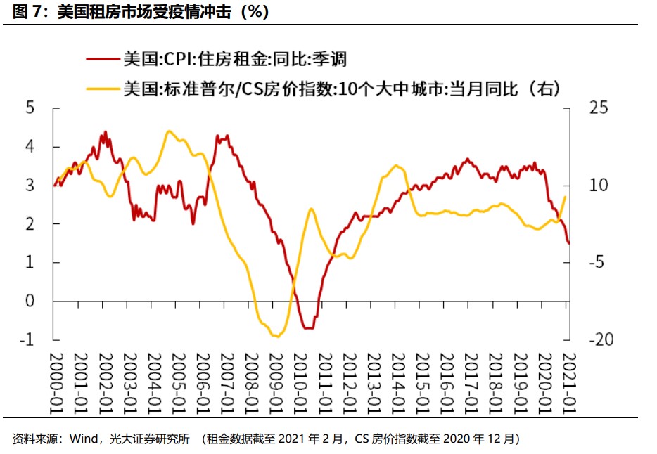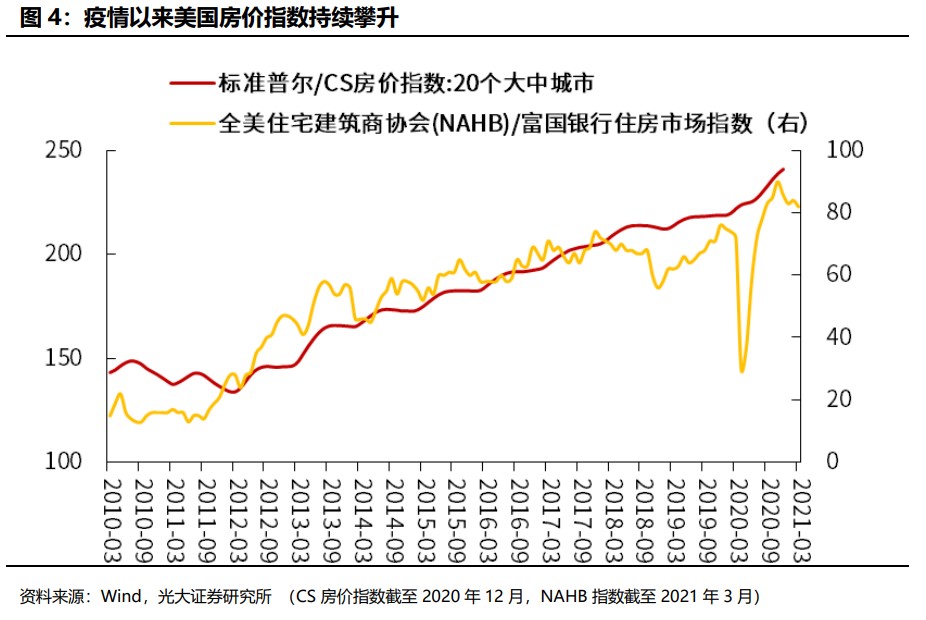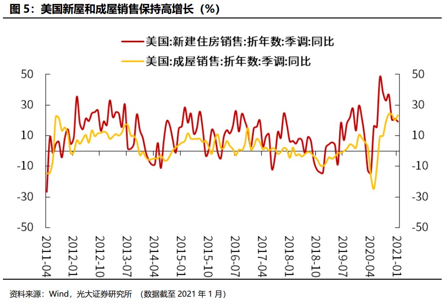 疫情并未打断美国房地产市场上行趋势。疫情外生冲击下,美国房地产市场仍保持高度景气。CS房价指数持续上涨,衡量全美建筑商信心的NAHB市场指数在2020年5月跌下荣枯线后快速反弹并升至10年来高位;新屋和成屋销售在2020年3月触底后迅速反弹并保持强劲增长,2020年下半年以来,连续多月同比增速超2位数,远超疫情前水平。2021年1月美国新屋销售折年数达92.3万户,高于预期的85.6万户,同比增长19.3%;2021年1月美国成屋销售达669万户,高于市场预期的660万户,同比增长23.7%。
