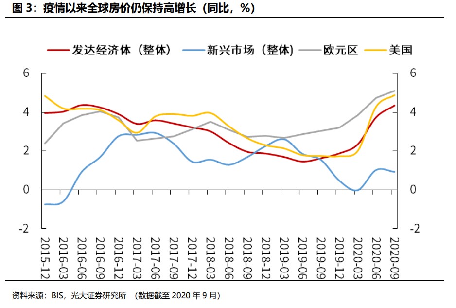 疫情之下,全球房地产市场热度不减。新冠肺炎疫情以来,各国出台大量财政刺激法案,各大央行也推出巨量货币宽松政策,受此影响,全球房地产市场仍保持高度景气。根据国际清算银行(BIS)数据,发达经济体2020年第三季度真实房价同比上涨4.4%,创2016年以来最大涨幅,其中美国和欧元区2020年三季度真实房价分别上涨4.9%和5.1%;新兴市场房价2020年三季度也同比上涨0.9%。