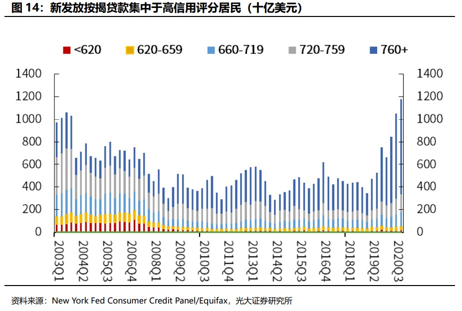 从按揭贷款结构看,目前美国次级贷款占比较低。根据纽约联储数据,新发放按揭贷款集中于偿债能力强的高信用评分居民(信用评分高于720分),而向低于660分居民发放的按揭贷款规模近年来处于较低水平,每季度约为500亿美元,远低于金融危机前每季度超1000亿美元的规模。