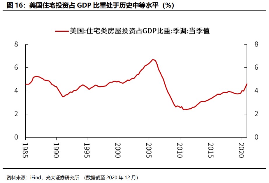 住宅投资占GDP比重适中。目前美国房地产投资占GDP比重为4.61%,在历史上属于中等水平,较2005年12月6.68%的历史高点仍有距离,上一轮周期中房地产占GDP比重接近5%的年份在2000年左右,因此美国房地产市场未来几年或仍有一定上行空间。