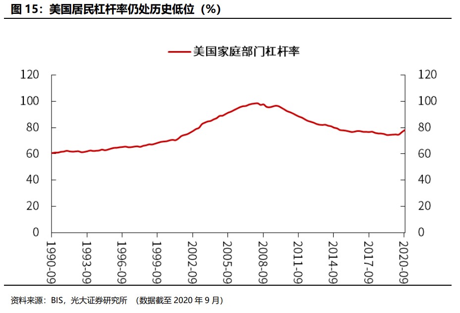 目前美国居民杠杆水平仍处低位。截至2020年3季度,美国居民债务占GDP比重为78%,较前几季度略有上升,但仍远低于金融危机前98%的居民杠杆率高点,目前居民仍有加杠杆空间。