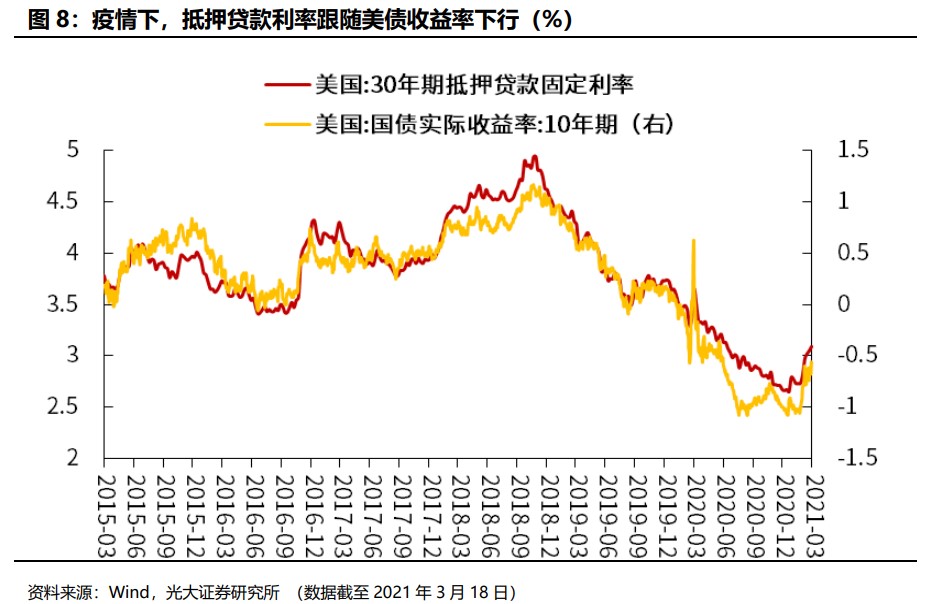 低利率降低居民购房成本,刺激购房需求。10年期美债实际收益率与美国30年期住房抵押贷款利率高度相关。疫情发生以来,美联储货币政策持续宽松,抵押贷款利率跟随美债收益率持续下行,处于多年来较低水平,从而导致居民购房成本下降,刺激购房需求。