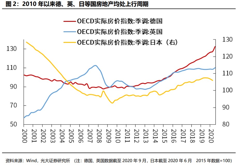 2008年金融危机后,全球开启新一轮库兹涅茨周期。2008年金融危机后,全球经济复苏,宽松货币政策下,利率持续位于低位,促进全球房地产市场繁荣,美欧日等发达国家房地产市场从2010年左右开启上行周期并持续至今。