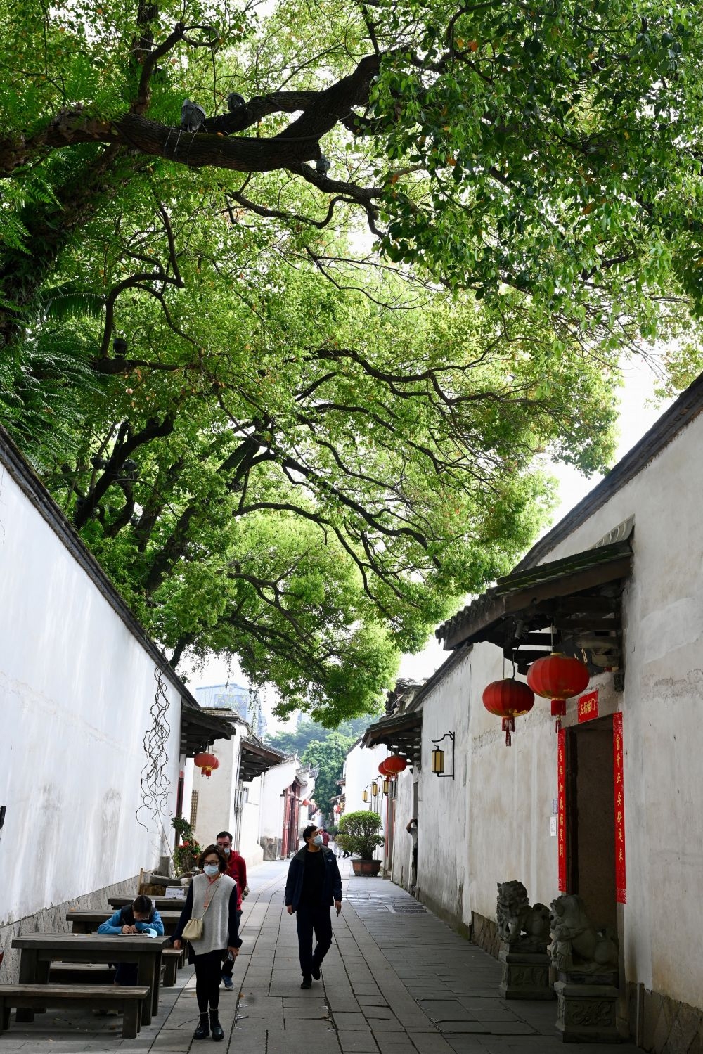 2021年3月14日,游客行走在绿树掩映的福州三坊七巷文化街区宫巷内。 新华社记者姜克红摄