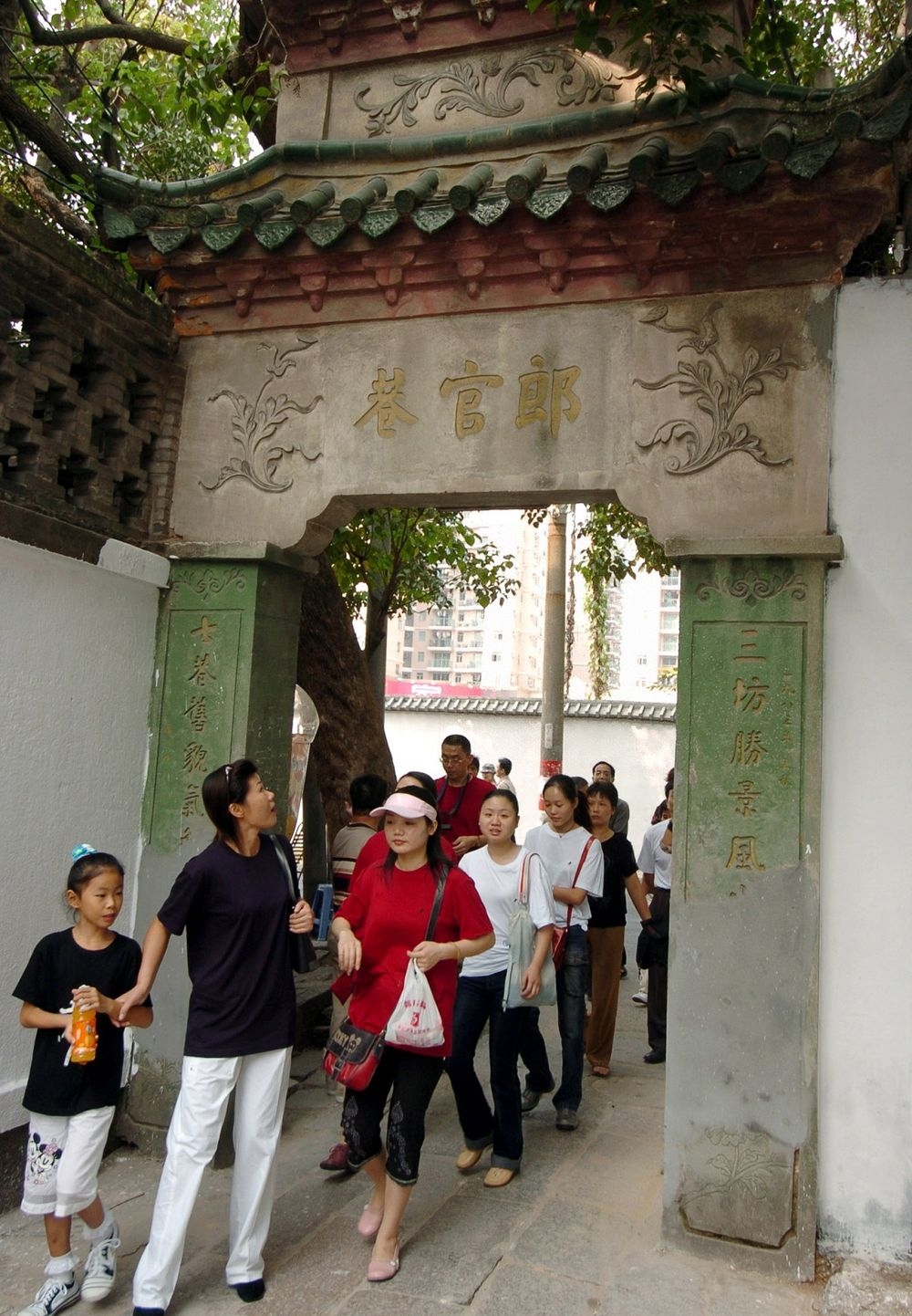 2004年10月1日,游客在福州市“三坊七巷”“郎官巷”游览。当日,福州市开通“三坊七巷”名人故居旅游线路,装修一新的福州市明清古建筑群“三坊七巷”首次对游客正式开放。 新华社记者姜克红摄
