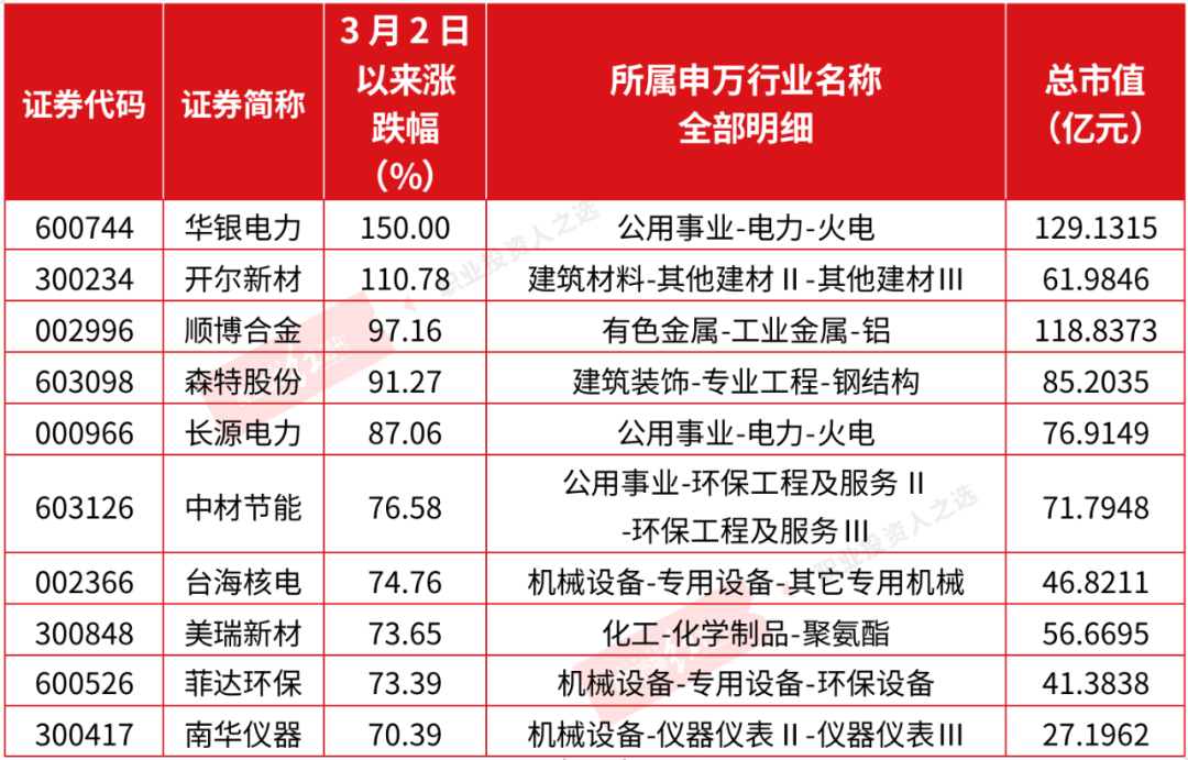 表1:3月2日以来涨幅榜前10名公司(剔除新股)