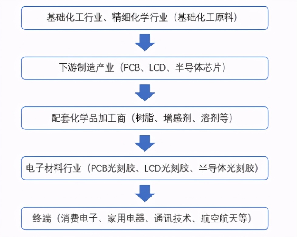 资料显示,光刻胶所涉产业链纷繁复杂,覆盖范围广泛,从上游的基础化工材料行业和精细化学品行业,到中游光刻胶制备,再到下游电子加工商和电子产品应用终端。作为微电子领域微细图形加工核心上游材料,光刻胶占据了电子材料至高点。然而对于这一应用广泛的品种,长期以来一直为海外企业占居领先地位,国产光刻胶因技术水平与国际先进水平存在较大差距而自给率仅约10%,且还主要集中在技术含量较低的PCB光刻胶领域。