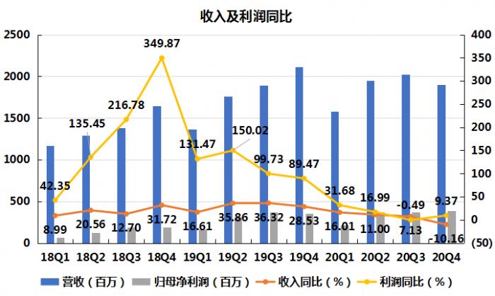 进入2020年,虽然一季度公司收入增速有所下滑,但是考虑到疫情大环境,公司的业绩表现已经是相当靓丽。但是二季度开始,公司下游主要客户被美国制裁,对公司经营的影响开始显现,三季度公司的收入增速进一步下滑,四季度转为负增长。
