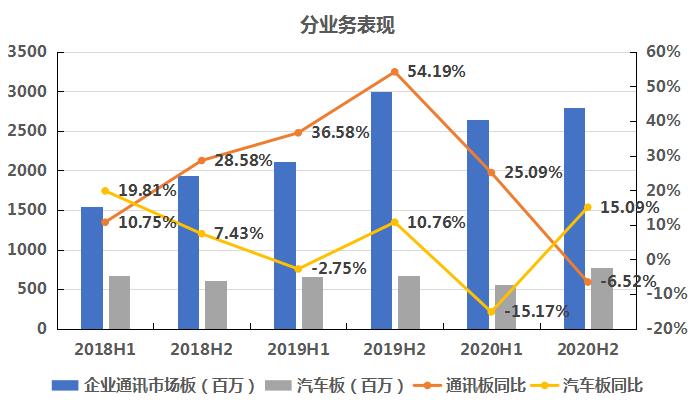 从上图可以看到,2018年和2019年,公司的企业通讯板业务表现最好,但是进入2020年,增长失去了动力,2020年下半年,公司的企业通讯板业务收入转为下降6.52%。
