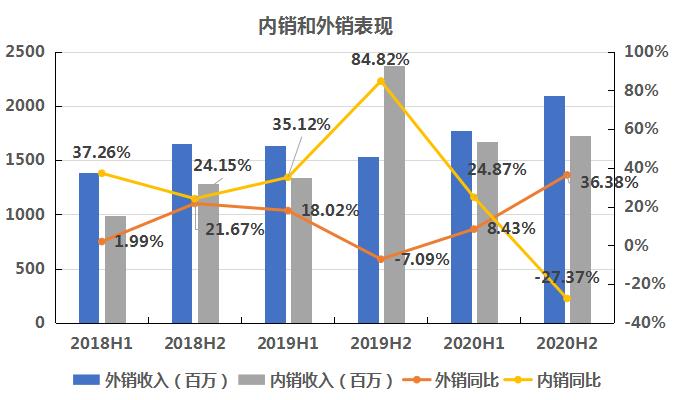 从上图可以看到,2020年下半年,公司外销业务增长了36.38%,增速创了2018年以来的新高,但是内销业务的拖累也非常明显。公司2020年下半年的内销业务萎缩了27.37%。