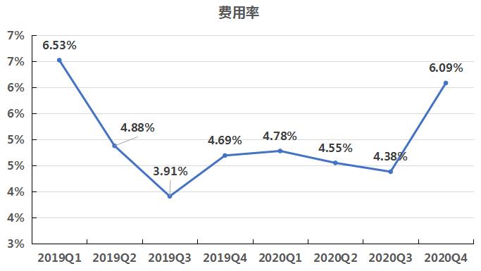 上图是公司的销售费用、行政费用和财务费用的总额占同期收入的比率。从上图可以看到,公司的费用率一直维持在比较低的水平,反映公司成本管控能力强。但是和过去五个季度相比,2020年四季度的费用率有所回升。