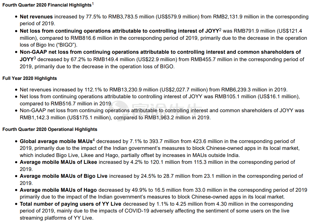 3、欢聚公布2020年Q4及全年财报:全年营收132亿,同比增长112%。