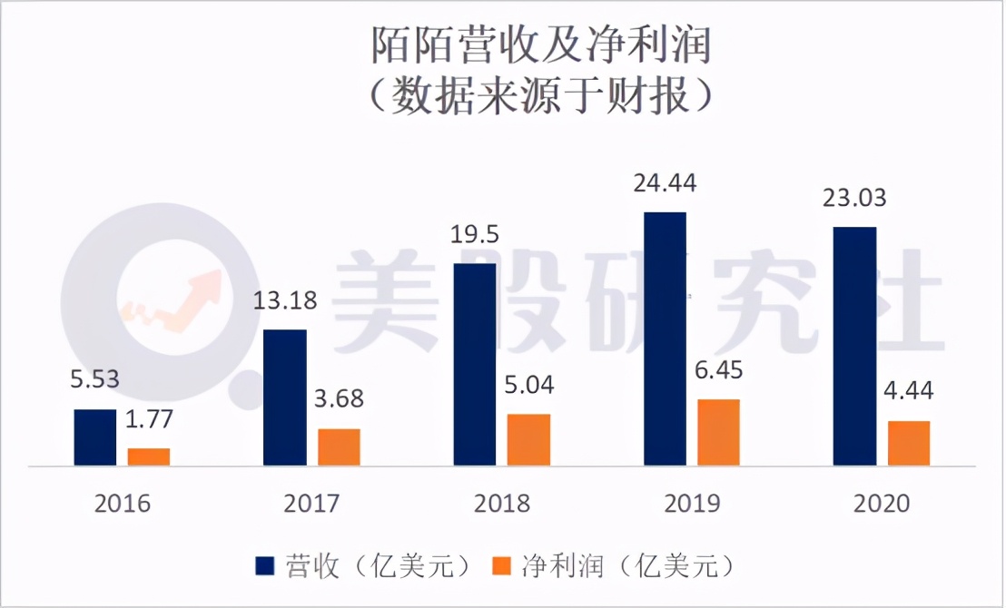 反观陌陌,目前市值仅为28.74亿美元,2020年营收为23.026亿美元,净利润达到4.439亿美元,且营收利润逐年都呈上涨趋势。