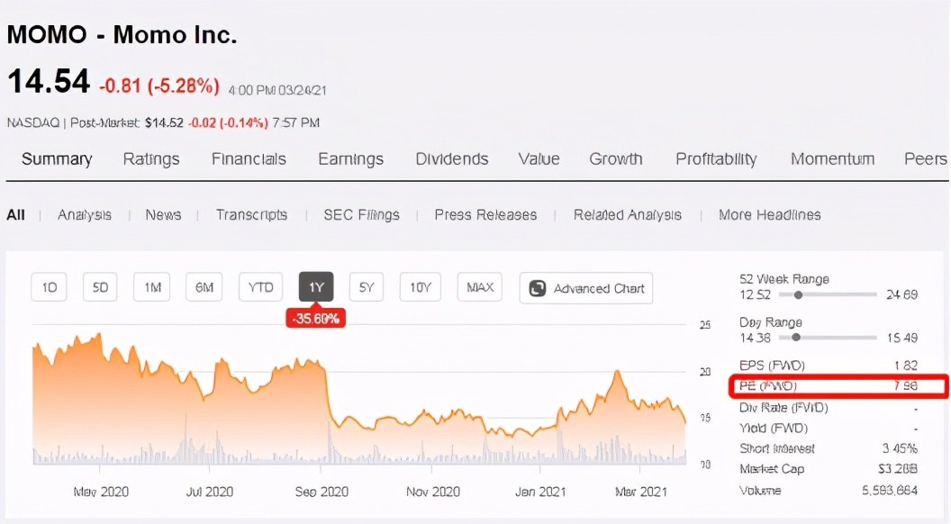 2014年陌陌上市时,定好发行价为13.5美元。截止至3月25日收盘时,陌陌股价为13.950美元,仅在其发行价上方。其在中国社交市场的地位与其增长、创收能力与Snap+Mtch相比,估值显得非常不合理。