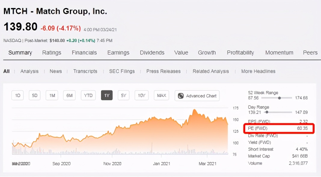 目前,陌陌远期市盈率为7.98倍,而Mtch的远期市盈率达到60.35倍。