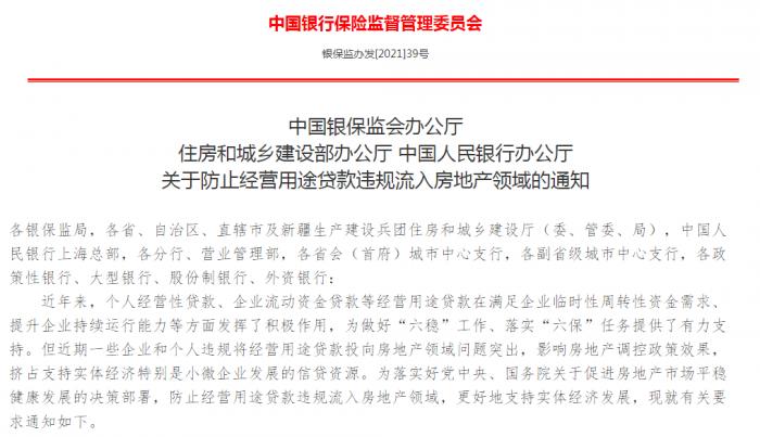 银保监会、住建部、央行:防止经营用途贷款违规流入房地产领域