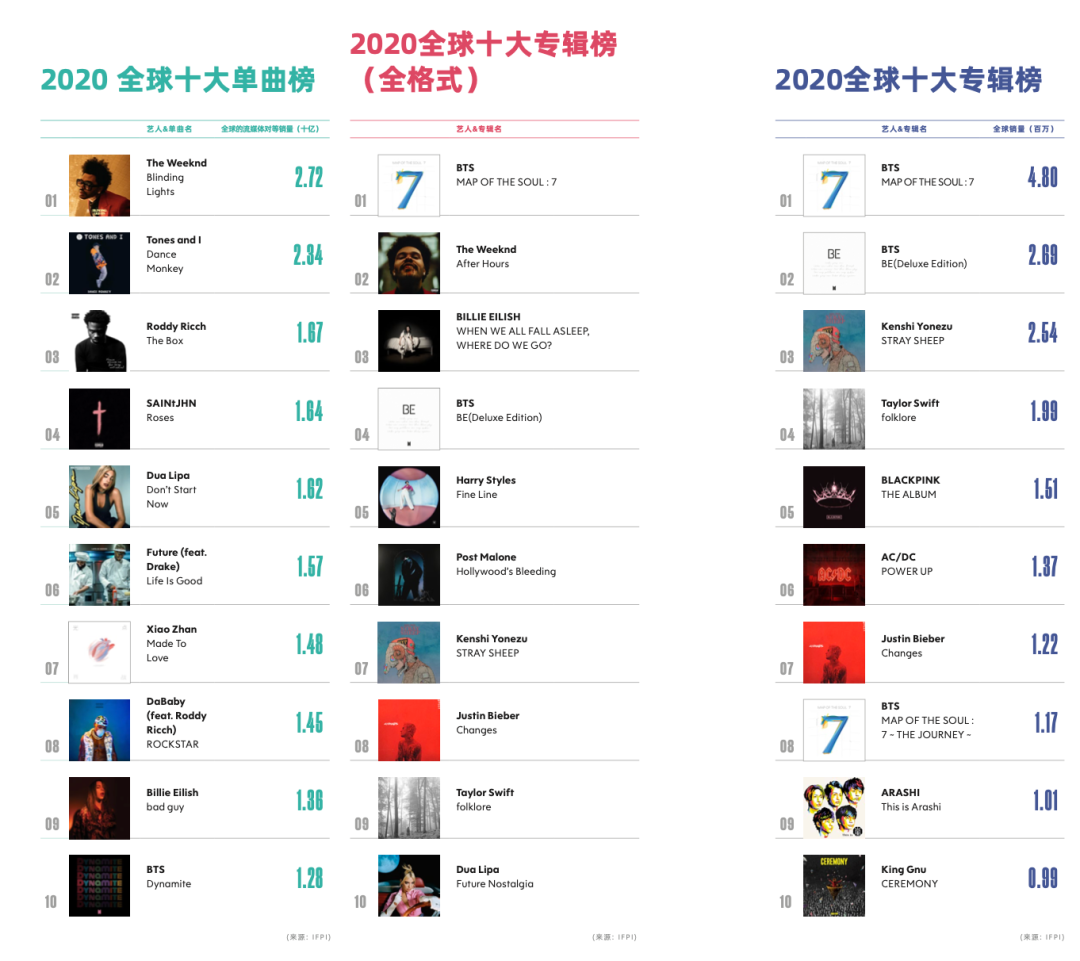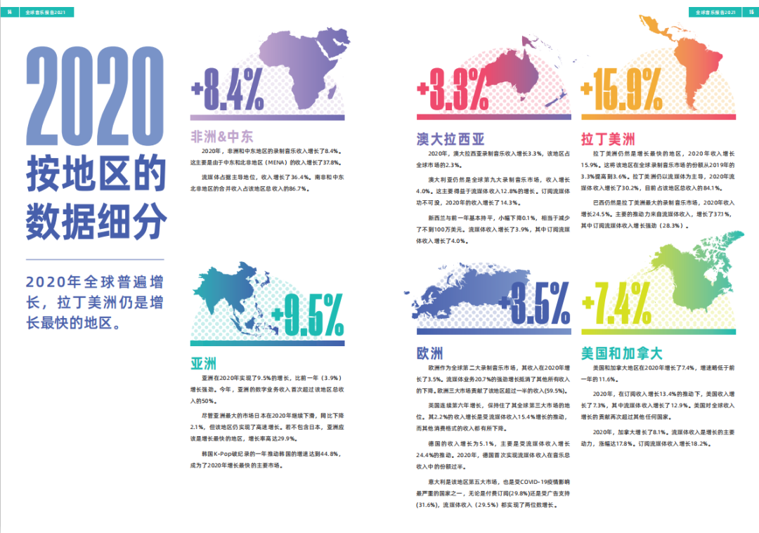 报告显示,亚洲最大的市场日本在2020年继续下滑,同比下降2.1%。若不包含日本,亚洲应该是增长最快的地区,增长率高达29.9%。这归功于2020年是韩国K-Pop破纪录的一年,它推动了韩国的增速达到44.8%,成为了2020年增长最快的主要市场。