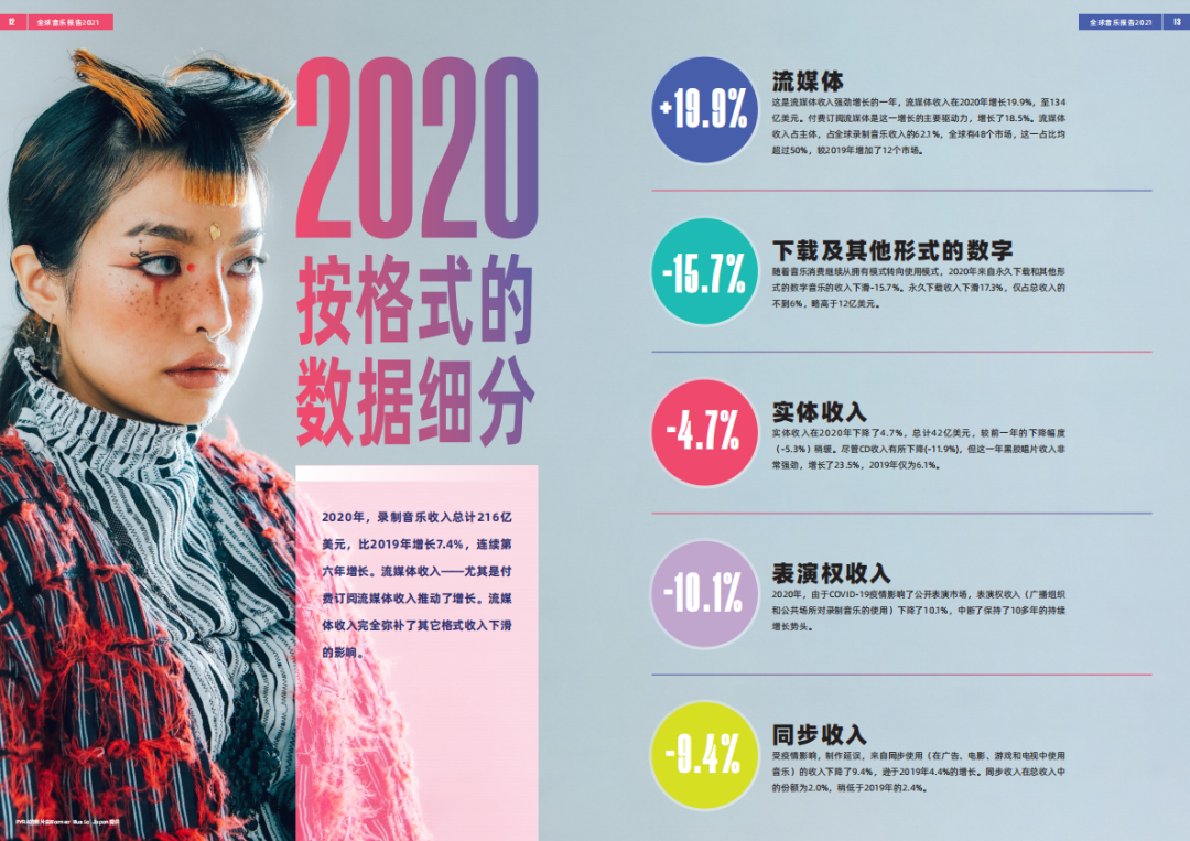 令人稍感惊讶的是,受疫情影响,制作延误,来自同步使用(在广告、电影、游戏和电视中使用音乐)的收入也下降了9.4%,而它在2019年曾实现了4.4%的增长。可见,受疫情打击更为严重的电影市场也间接影响了音乐市场的收入。全球性灾难之下,任何地区、任何领域都无法独善其身。