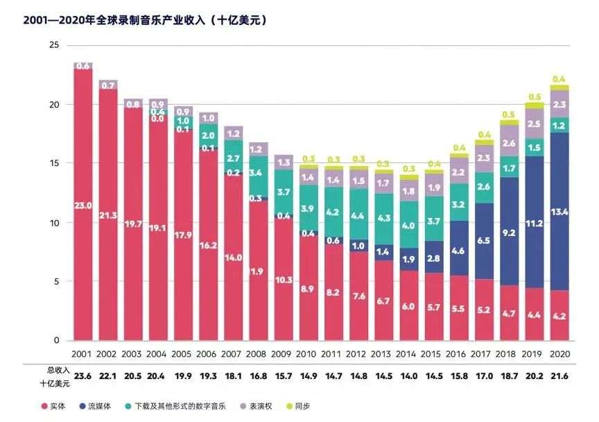2020年,在全球疫情大流行的背景下,全球录制音乐市场收入不降反升,由于线下演出停摆,流媒体服务扛起了增长大旗,并成功弥补了其它格式收入下滑的影响。