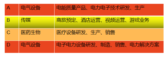C虽然属于不同行业,但其中医疗设备研发制造也会涉及到电力电子设备研发,与A、D的业务类型其实有所类似。
