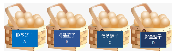 我们今天说的主要是大家常见的一种分类,按投资标的的风险特征从高到低来看的话就是股票型基金、基金中基金、混合型基金、债券型基金以及货币基金,他们也就代表着不同的篮子。