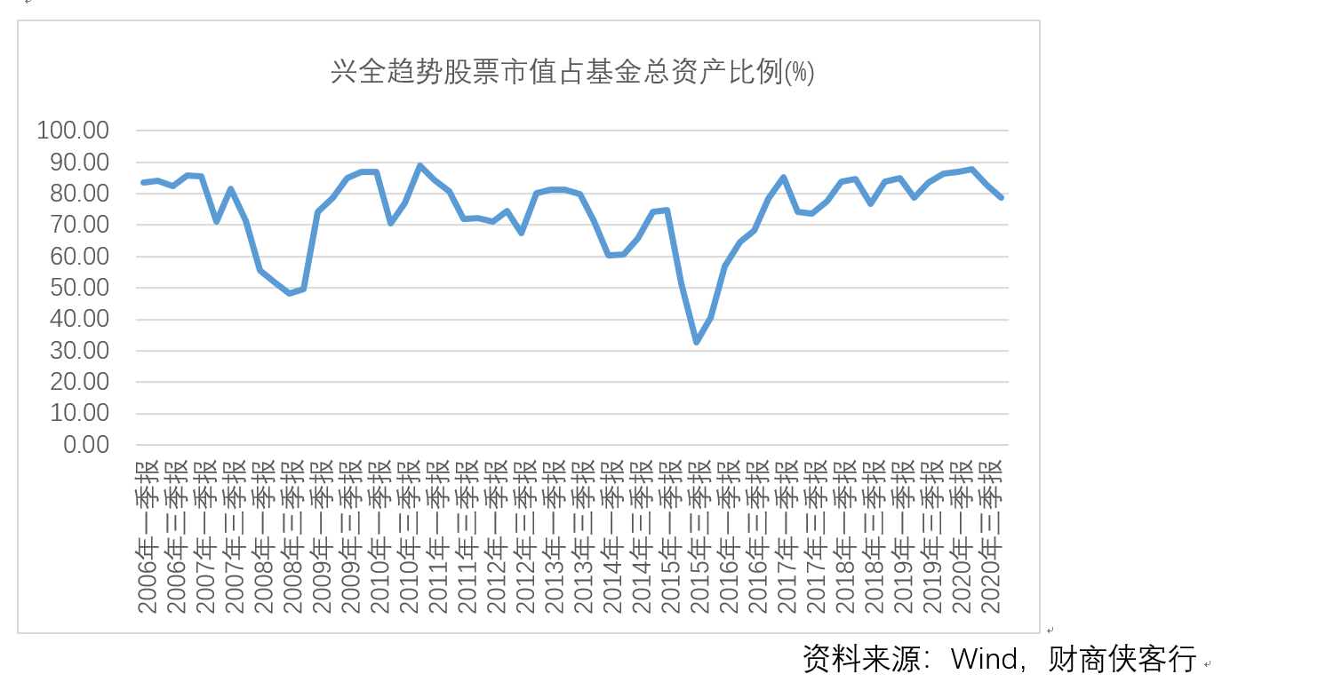 从持仓数据看,兴全趋势曾经有几次大的择时,在2008年曾经把股票仓位大幅砍到50%附近,在2015年的三季度股票仓位曾经下滑到32%。2020年底也略微降低仓位。